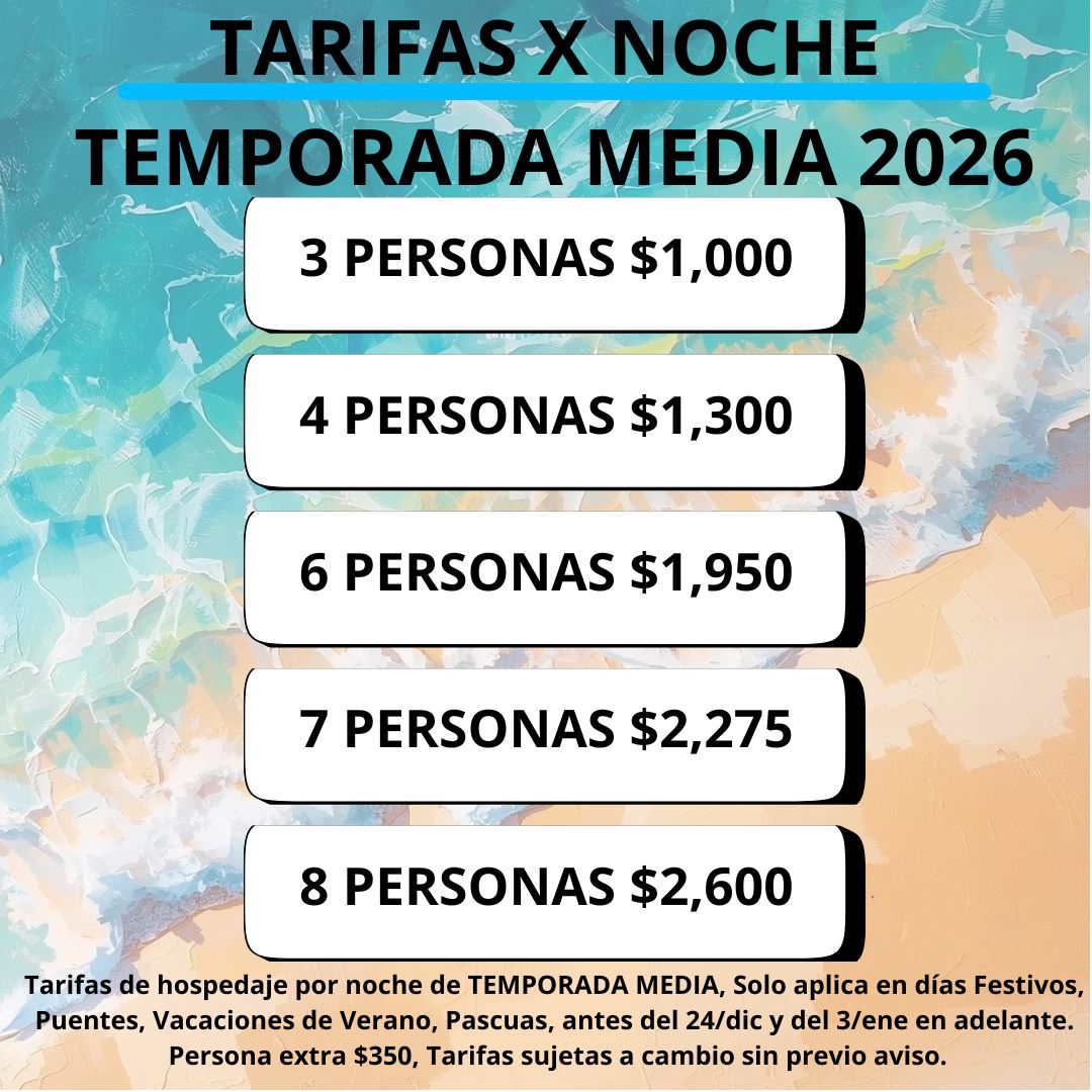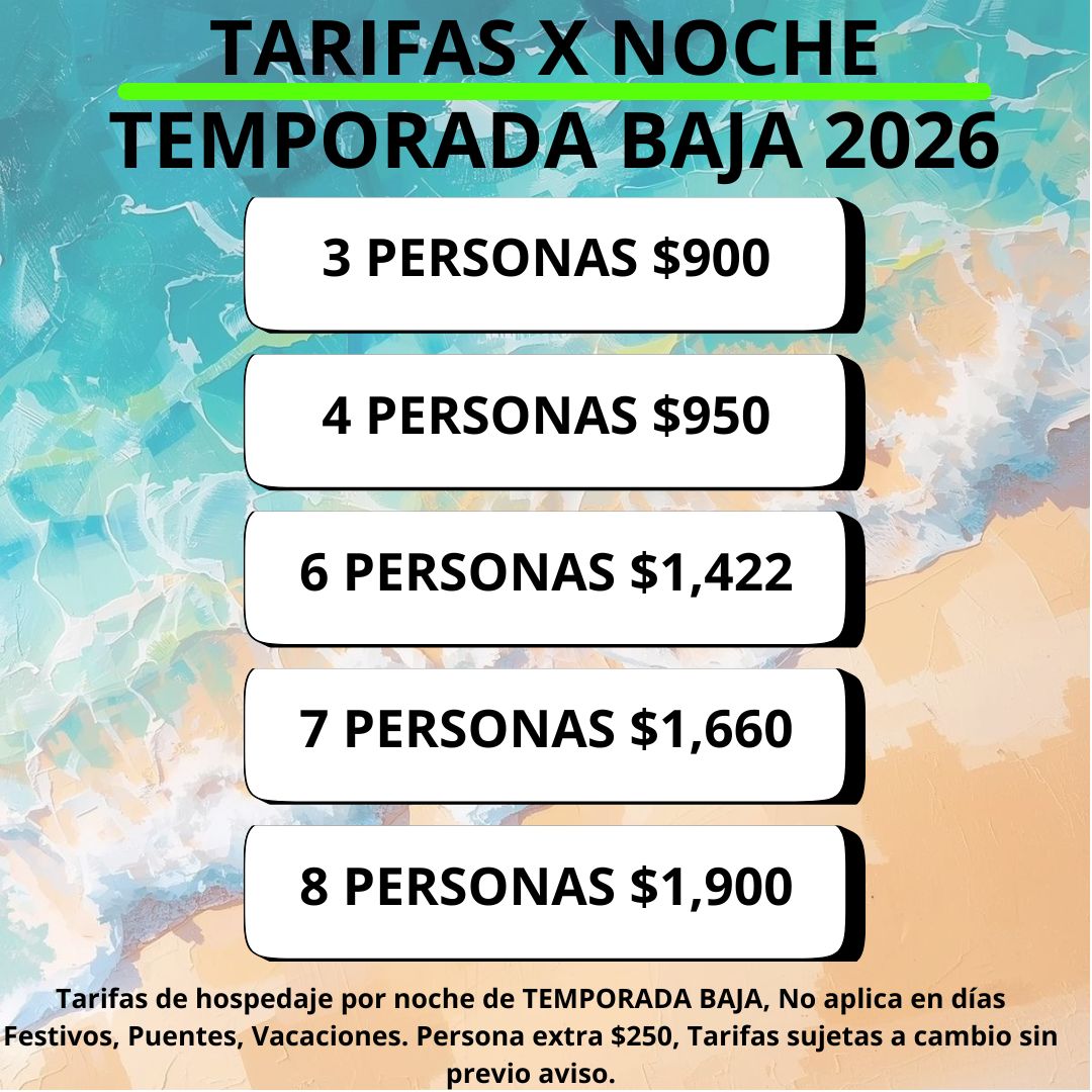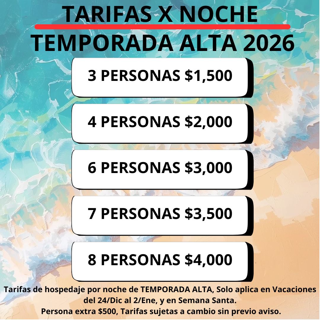 Tarifa alta semana santa y diciembre. La tarifa es por noche y de acuerdo al número de personas.